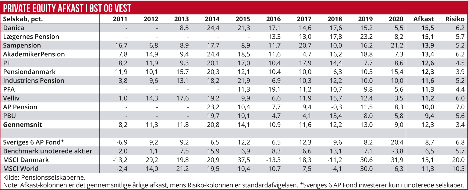 Tallene viser, at de store pensionsselskaber systematisk over de seneste ti år har været ekstremt gode til at skabe afkast på disse investeringer. Flere store pensionsselskaber har over de seneste ti år outperformet det globale aktiemarked med 3 til 4 procentpoint årligt.