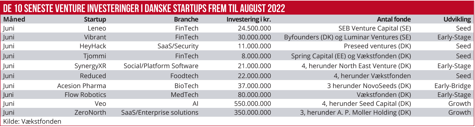 Den største investering indenfor de seneste kapitalrunder er den halve mia. kr., der fortrinsvis blev hentet fra tre danske ventureselskaber og den franske Ventec-fond til selskabet Veo Technologies. Ifølge Vækstfondens opgørelse er det en af de få start-ups, der arbejder med kunstig intelligens (AI). Ellers er det generelt fintech-start-ups, som dominerer denne gang, med tre ud af ti kapitalrunder, dog ikke med de store beløb, man tidligere har set sendt til denne type startups.