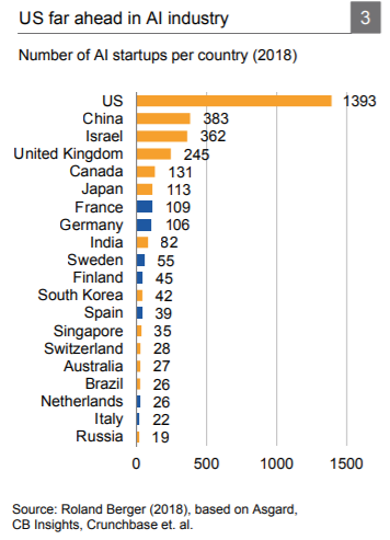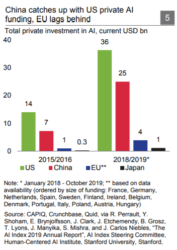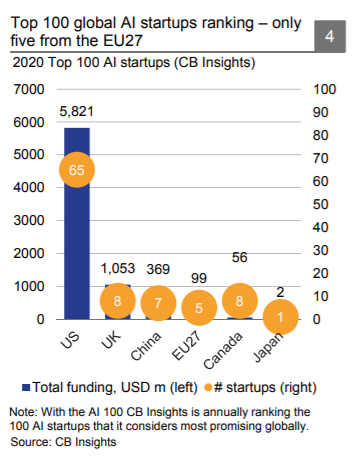 Deutsche Bank viser i en analyse, at der er meget lang vej, før EU-landene kan blive en kunstig intelligens superstar. Kunstig intelligens sker i et kapløb mellem to heste – USA og Kina. Det kræver gigantiske investeringer at hamle op med de to – især i en tid, hvor pengene bruges på coronabekæmpelsen.