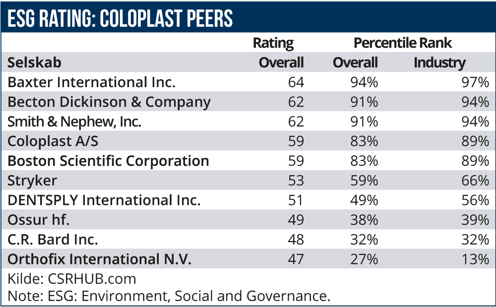 I scoren indgår dog endnu ikke Coloplasts netop udsendte CSR-rapport for det skæve regnskabsår 2016/2017. Om det alene indeholder informationer, der kan tilføje et point eller to, må kommende opdateringer vise. Faktum er nu, at Coloplasts rating score er faldet fra 62 i januar 2016 til nu 59, mens fx de amerikanske CSR-frontløbere i peergruppen Baxter og Becton i samme periode uændret fastholder sin score på hhv. 64 og 62. Engelske Smith & Nephew hæver ratingscoren med et enkelt point for perioden, fra 61 til 62 I percentile placeringer – dvs. den indbyrdes relative ESG-rangering i forhold til alle godt 8000 fuldt ESG ratede selskaber i verden – taber Coloplast dermed samlet set terræn i forhold til bæredygtig konkurrenceevne. Coloplast er med en aktuel placering i 83 percentilen stadig flot placeret, men de tre frontløbere i peergruppen har altså konsolideret og udbygget positionen som de stærkeste til at konkurrerer på bæredygtige indikatorer.