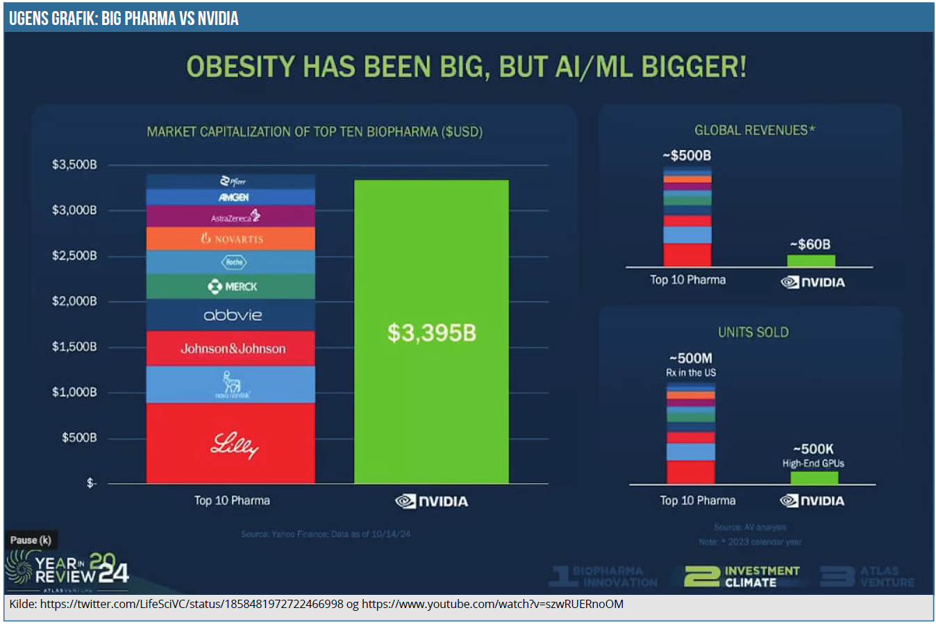 Det leder direkte videre til den næste grafik, som sætter fedmemarkedet i perspektiv, for selvom værdiskabelsen har været så stor, som vi lige har set, så er det vand i forhold til AI-chip-giganten Nvidia, som det fremgår af den næste grafik. Her ses, at markedsværdien af Nvidia er på højde med summen af de 10 største pharmaselskaber inkl. Novo og Lilly.