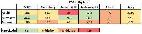 En gennemgang af seks globale ESG-ratingbureauers bæredygtige vurdering af Apple, Microsoft og Amazon viser meget forskellige resultater. Apple tildeles for eksempel en meget lav ESG score af RobecoSAM men topkarakter af Sustainalytics.