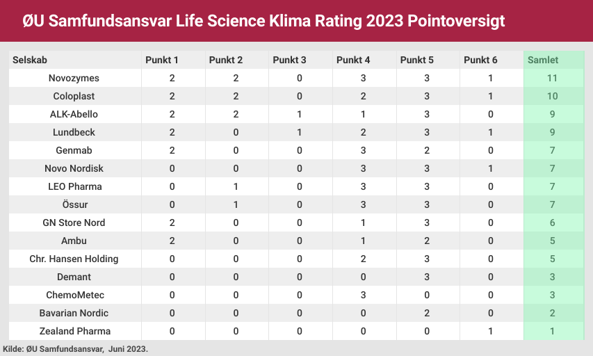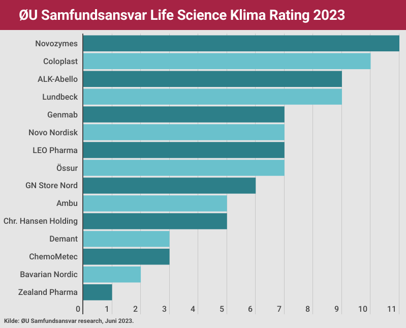 Med 11 point ud af 13 mulige indtager Novozymes førstepladsen i ØU Life Science Klima Rating 2023. Herefter følger Coloplast med 10 point – ALK-Abello og Lundbeck deler tredjepladsen, begge med 9 point.