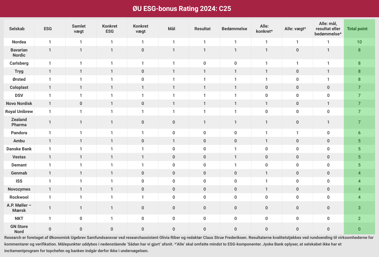 Økonomisk Ugebrevs rating af ESG-komponenter i C25-selskabernes bonusprogrammer for topchefen udpeger flere bundskrabere, blandt andet GN Store Nord, NKT og Mærsk. Med i toppen ligger Ørsted og Carlsberg, sammen med Nordea, Tryg og Bavarian. Årets rating viser, at næsten alle C25-topchefer har variabel aflønning med ESG-komponenter. Kun CEO fra GN Peter Karlstromers bonusprogram indeholder ikke ESG-komponenter, skriver redaktør Claus Strue Frederiksen.