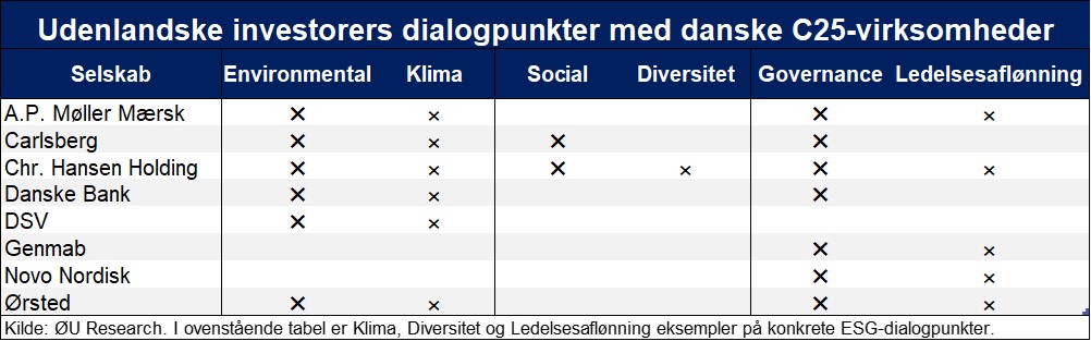 Hvor danske storinvestorer i ligeså høj grad er i ESG-dialog med danske virksomheder om S’et (f.eks. arbejdstagerrettigheder og diversitet) som G’et (herunder ledelsesaflønning og bestyrelsessammensætning) og en smule mindre om E’et (klima og miljø) er internationale storinvestorer hovedsageligt i dialog med danske selskaber om E’et og G’et men stort set ikke om S’et.