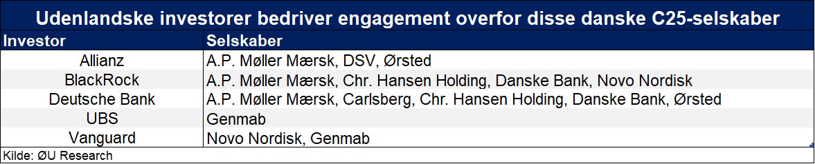 Internationale storinvestorer er således i dialog med væsentligt færre danske C25-selskaber end de danske storinvestorer, der bedriver engagement overfor hele tyve C25-selskaber. Kun Bavarian Nordic, Demant, Lundbeck og Simcorp er helt undtaget fra at optræde på dialoglisterne.