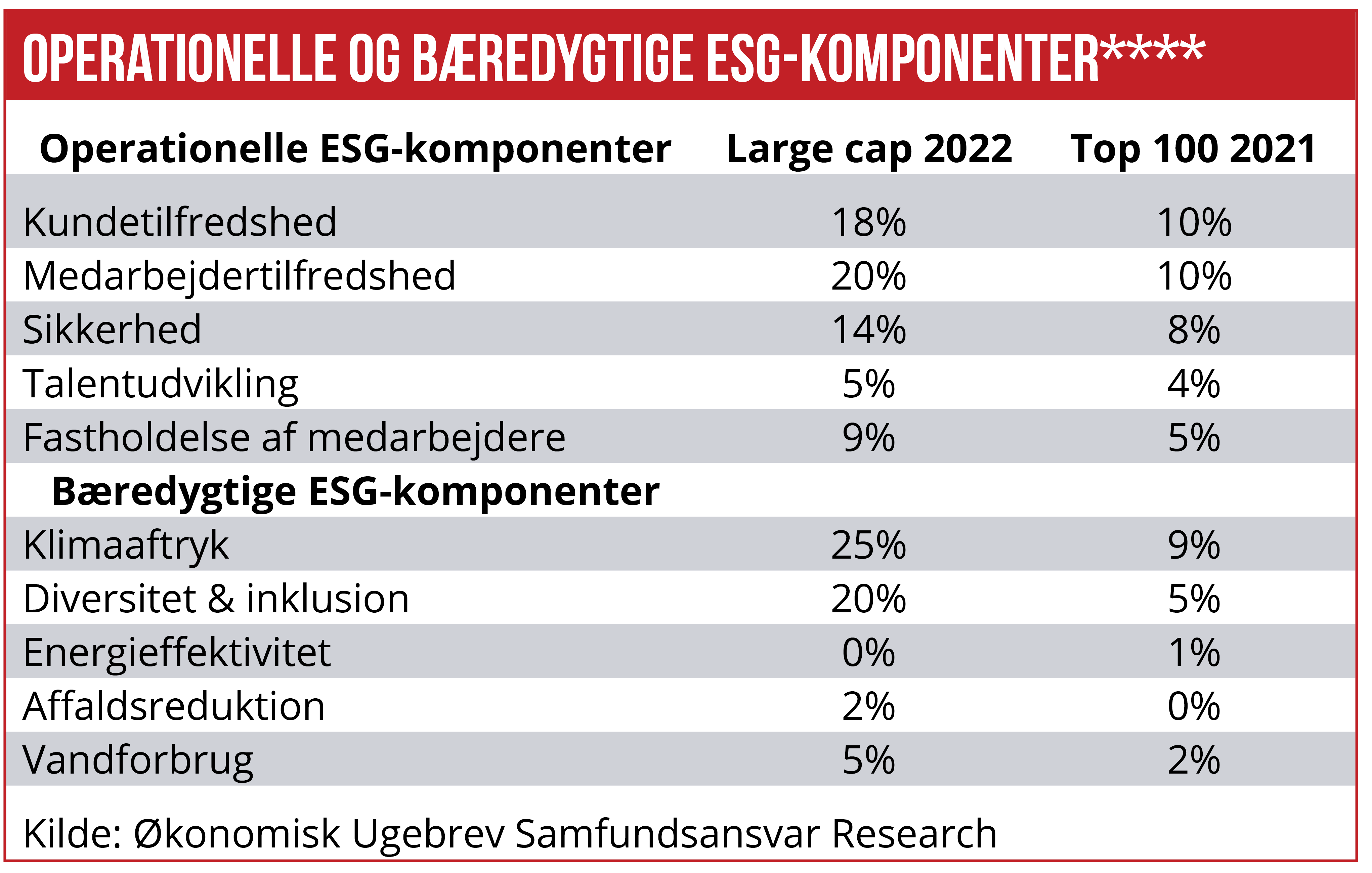 Vores undersøgelse viser, at det er de såkaldt operationelle ESG-komponenter, der traditionelt set er tæt knyttet til forretningsdriften, som eksempelvis kundetilfredshed og fastholdelse af medarbejdere, der dominerer. De såkaldt bæredygtige ESG-komponenter, der er kendetegnet ved et bredere socialt og miljømæssigt sigte som eksempelvis klimaaftryk og vandforbrug, fyldes samlet set en anelse mindre i chefløn-programmerne i de danske large cap-selskaber.***