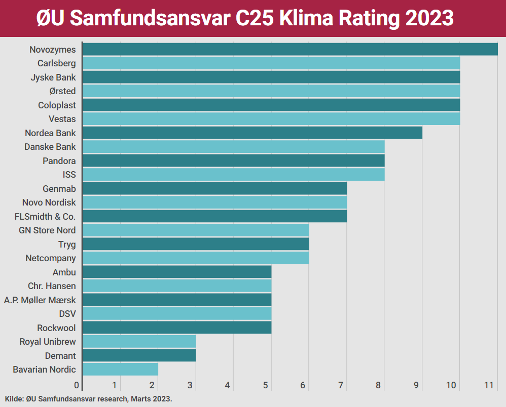 Den øverste plads i ØU’s årlige C25 klimarating indtages af Novozymes, herefter følger Carlsberg, Coloplast, Jyske Bank, Vestas og Ørsted. Disse seks virksomheder er alle kendetegnet ved ikke blot at tale om klima, men rent faktisk levere betydelige resultater. Eksempelvis har vindmøllegiganten Vestas reduceret sit samlede scope 1, 2 og 3 klimaaftryk med 22 procent i forhold til sidste år. I samme periode har Jyske Bank reduceret sit samlede aftryk med ti procent.