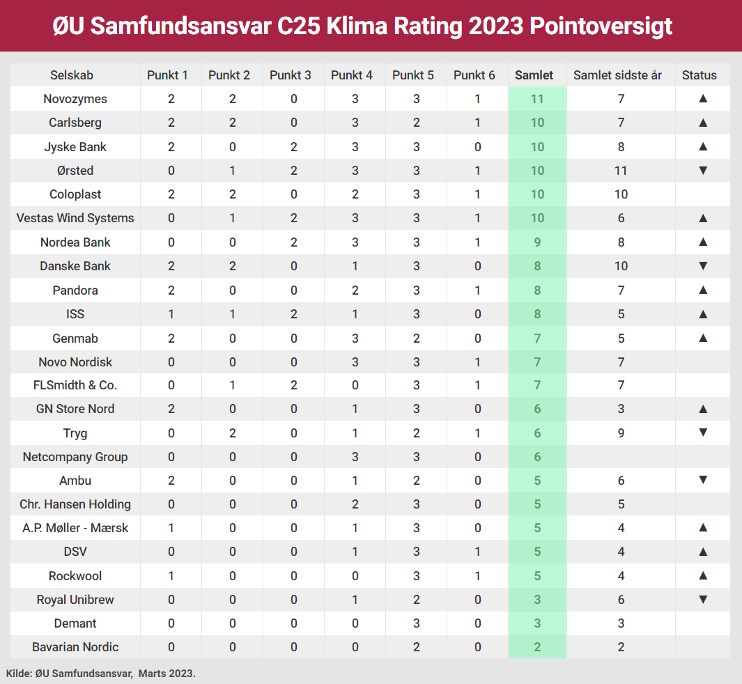Med udgangspunkt i virksomhedsrapporter udgivet i 2023 har vi indsamlet klimadata fra C25-selskaberne og på den baggrund tildelt virksomhederne point for hvert af de seks målepunkter (en mere udførlig beskrivelse af de seks målepunkter og pointtildelingen findes her).