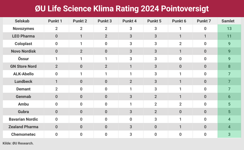 Med udgangspunkt i virksomhedsrapporter udgivet i 2024 har vi indsamlet klimadata fra danske life science-selskaber og på den baggrund tildelt virksomhederne point for hvert af de syv målepunkter (en mere udførlig beskrivelse af de seks målepunkter og pointtildelingen findes her).