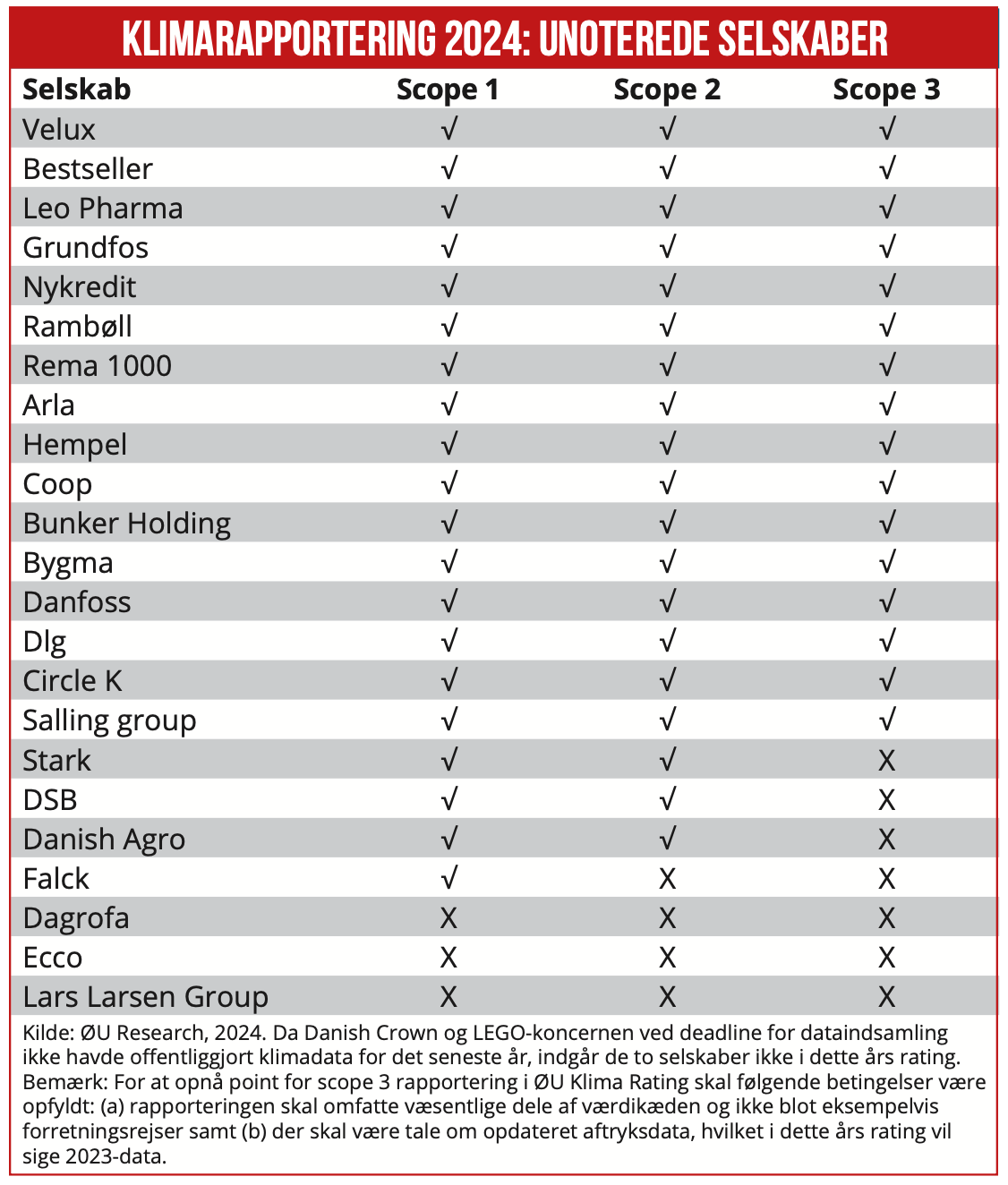 ØU Klima Rating 2024: Mere end to ud af tre af store unoterede danske selskaber rapporterer om klimaaftrykket for både egne operationer og værdikæden, herunder fra deres leverandører. Sidste år var det under halvdelen. På ét enkelt år har knap hvert tredje unoterede selskab forbedret klimarapporteringen markant. Blandt andet er Bygma, Coop og Danfoss det seneste år begyndt at rapportere om aftrykket fra værdikæden, det såkaldte scope 3, skriver redaktør Claus Strue Frederiksen i denne gennemgang af 23 store unoterede selskabers klimarapportering.