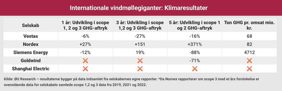 I 2023 omsatte Vestas for 115 milliarder kroner og havde et samlet GHG-aftryk på 7,8 millioner ton. Det svarer til, at Vestas udledte 68 ton GHG pr. omsat million kroner. Til sammenligning udleder tyske Nordex 82 ton GHG pr. omsat millioner kroner, altså 20 procent mere end Vestas.