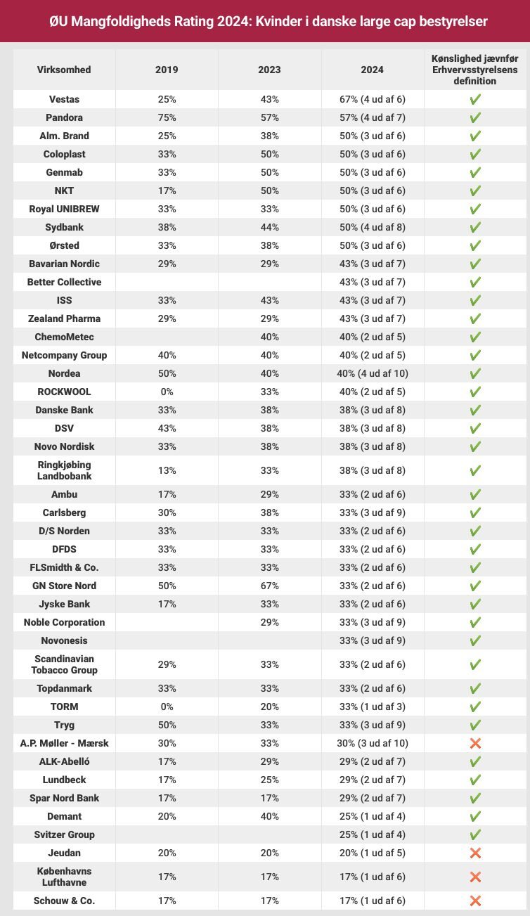 Kilde til tabel: cvr.dk 10. sep. 2024. Undtagen Nordea, Noble Corporation og Novonesis; her er data hentet fra hjemmesiden. I kortlægningen indgår kun bestyrelsesmedlemmer, der er valgt på selskabernes generalforsamlinger (dvs. ekskl. medarbejdervalgte).