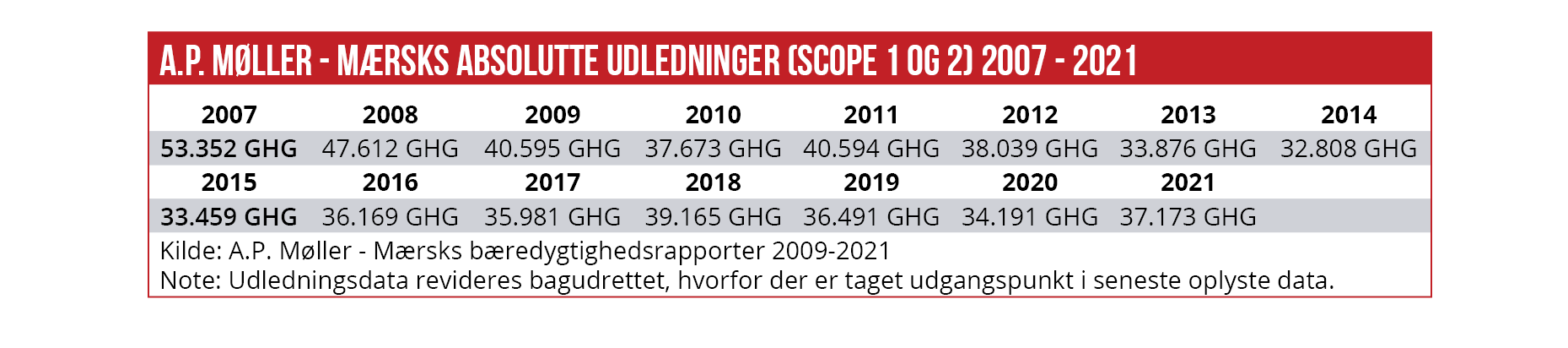 I 2010 udledte (scope 1 og 2) A.P. Møller-Mærsk 37.673 tusind tons GHG, i 2021 var udledningstallet 37.173 tusind tons GHG, altså omtrent det samme. I forhold til selskabets samlede udledninger var 2014 det bedste år, med 32.808 tusind tons GHG, hvorimod 2007 var det værste år, her udledte A.P. Møller-Mærsk 53.352 tusind tons GHG. Til sammenligning udledte hele Danmark i 2020 – indenfor landets grænser – 42.000 tusind tons GHG.