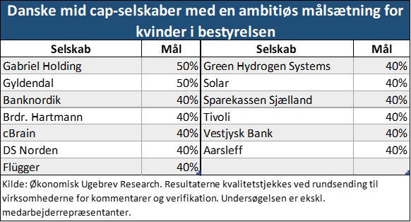 Det er ikke kun Gabriel Holding og Gyldendal, der har ambitiøse målsætninger på området. Også Aarsleff, Banknordik, Brdr. Hartmann, cBrain og syv andre mid cap-selskaber har en målsætning om 40 procent kvinder i bestyrelsen.