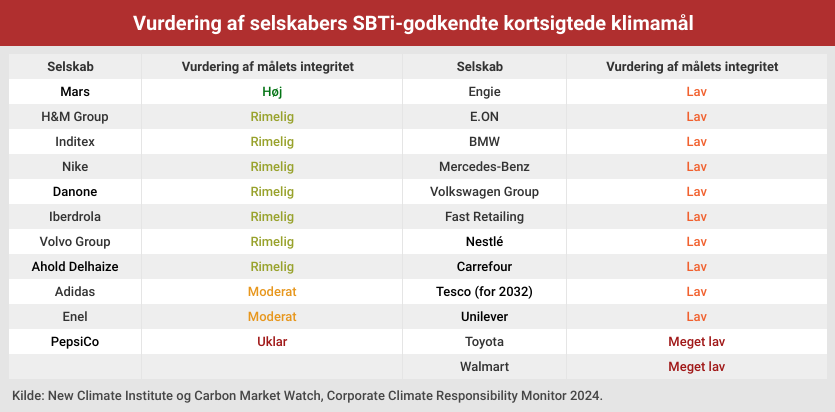 Den 9. april i år udgav New Climate Institute og Carbon Market Watch rapporten Corporate Climate Responsibility Monitor 2024, hvori de to non-profit organisationer undersøger og evaluerer 28 af verdens største selskabers klimamål, hvoraf hovedparten er godkendt af Science Based Targets initiative (SBTi), som anses for at være erhvervslivets guldstandard på klimaområdet. Blandt andet mål sat af selskaber som BMW, Nestlé og Walmart dumper.