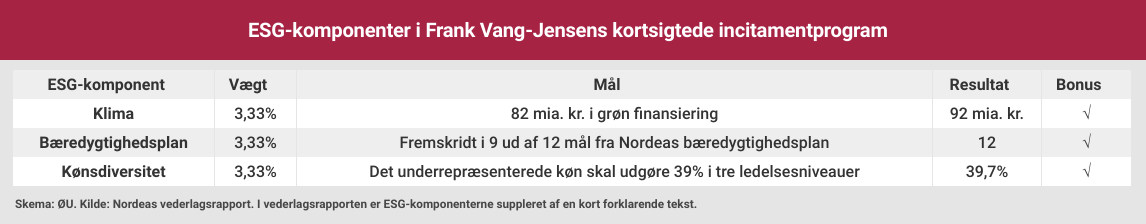 Ifølge Nordeas seneste vederlagsrapport indeholder Frank Vang-Jensens kortsigtede bonusprogram tre ESG-komponenter, der samlet set vægter 10 procent af programmet. De tre ESG-komponenter omhandler volumen af grøn finansiering, implementering af bæredygtighedsplan samt kønsbalance i bankens ledelseslag.
