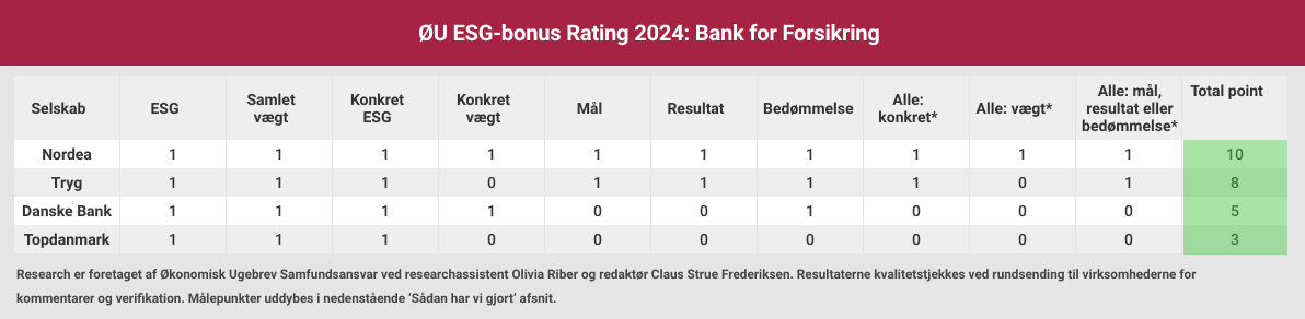 Nordeas oplysninger om de tre ESG-komponenter har en detaljeringsgrad, der udløser maksimumpoint i Økonomisk Ugebrevs rating af ESG-komponenter i topchefbonus. Sigtet med det nye rating-værktøj er at vurdere og rangere danske selskaber ud fra deres transparens omkring brugen af ESG-komponenter i topchefens bonusprogram. Se mere om ratingens ti målepunkter nederst i artiklen.