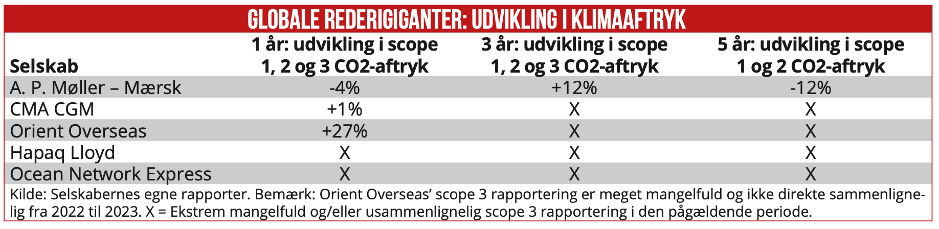 A. P. Møller – Mærsk er det eneste af de fem selskaber, der kan fremvise en reduktion af selskabets samlede scope 1, 2 og 3 CO2-aftryk det seneste år – som nævnt, en reduktion på fire procent. I samme periode har franske CMA CGM øget sit aftryk med én procent, mens Hong Kong-baserede Orient Overseas’ samlede CO2-aftryk er steget med 27 procent.