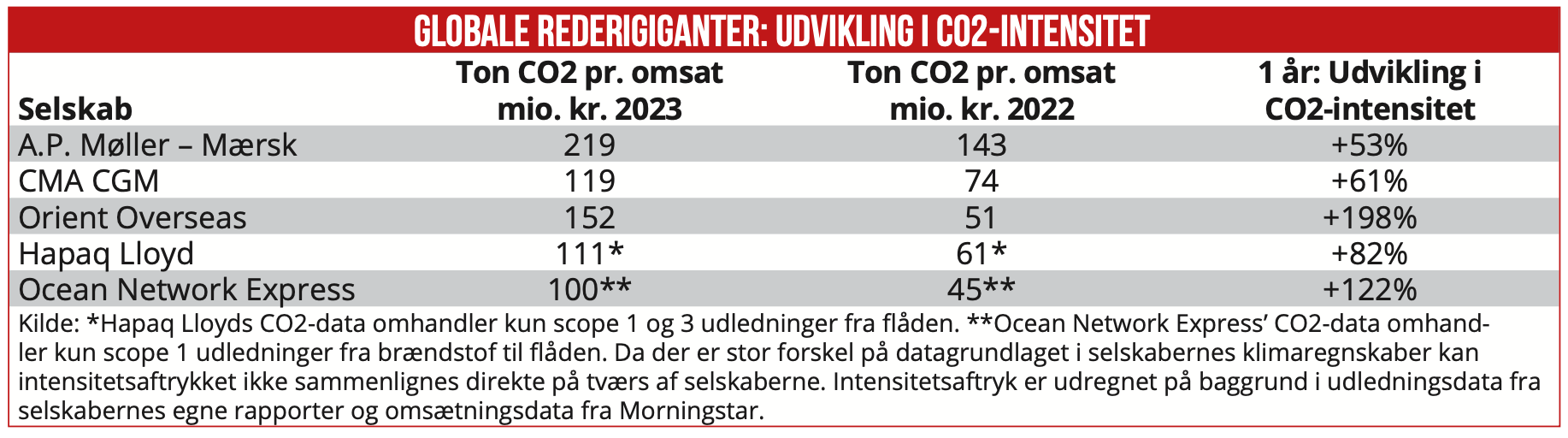 Eksempelvis er intensitetsaftrykket for den franske shippinggigant CMA CGM steget fra 74 ton pr. omsat million kroner i 2022 til 119 ton i 2023, altså en stigning på 61 procent. Japanske Orient Overseas topper dog listen, her er intensitetsaftrykket steget 198 procent det seneste år.