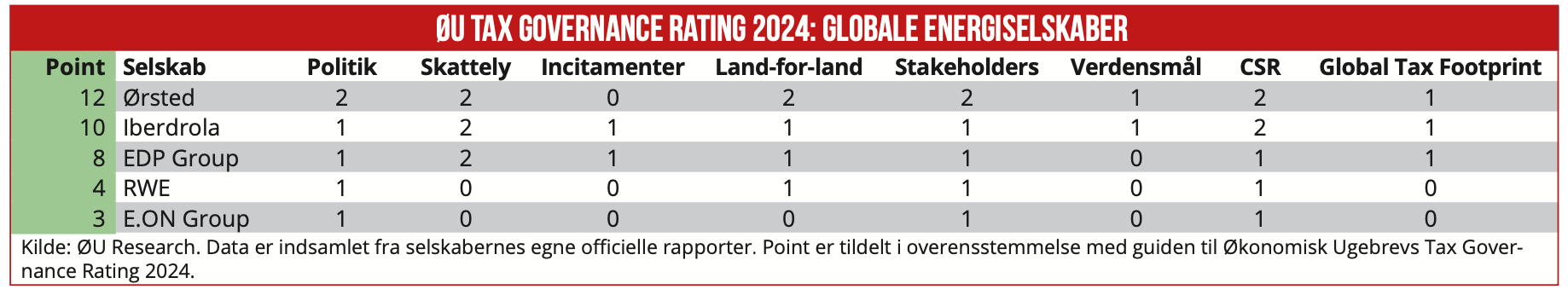 Med 12 point ud af 14 mulige indtager Ørsted førstepladsen i Økonomisk Ugebrevs Tax Governance Rating 2024 for store internationale energikoncerner (mere om pointtildelingen i afsnittet ’Sådan har vi gjort’ nederst i denne artikel). Økonomisk Ugebrevs undersøgelse viser, at det danske energiselskab præsterer klart bedre på skattetransparens end konkurrenter som tyske RWE og spanske Iberdrola.