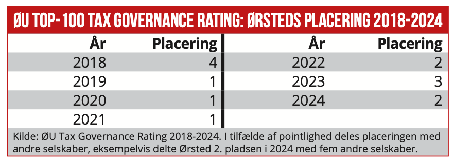Som det fremgår af nedenstående tabel, har Ørsted i en årrække ligget med i toppen af Økonomisk Ugebrevs årlige top-100 skatterating – siden 2019 er energikæmpen blevet nummer ét tre gange. I 2024 blev Ørsted og fem andre danske top-100 selskaber kun overgået af STARK og Grundfos, som delte førstepladsen.