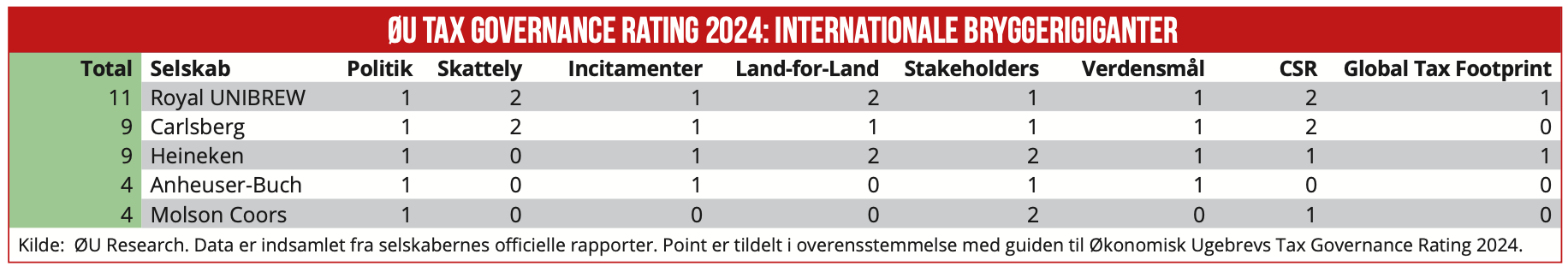 Med 11 point ud af 14 mulige indtager Royal Unibrew førstepladsen i Økonomisk Ugebrevs Tax Governance Rating 2024 for fem store bryggerikoncerner (mere om pointtildelingen i afsnittet ’Sådan har vi gjort’ nederst i denne artikel). På andenpladsen ligger Carlsberg og hollandske Heineken med 9 point.
