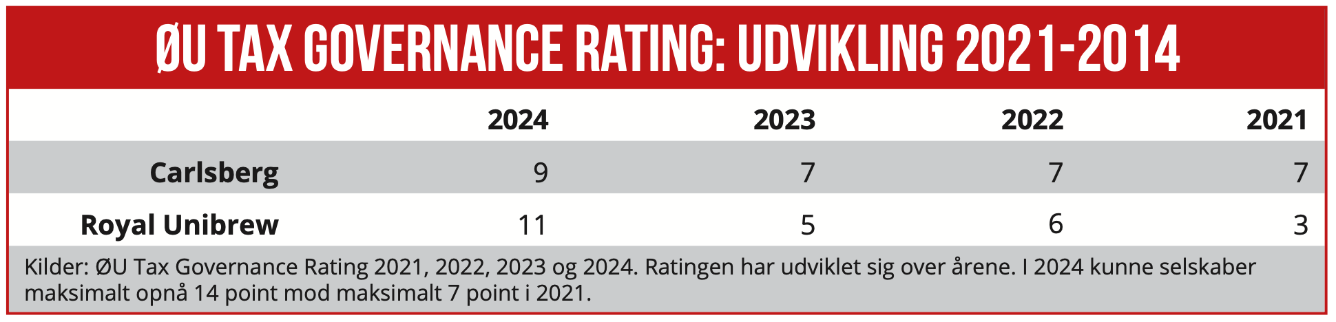 Modsat Carlsberg har Royal Unibrew forbedret sin score i Økonomisk Ugebrevs Tax Governance Rating markant – fra 3 point ud af 7 mulige i 2021 til 11 point ud af 14 mulige i 2024.