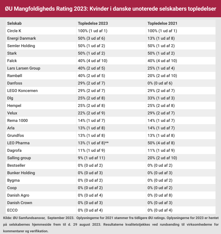 ECCO er dog ikke alene, også i Bestseller, Bunker Holding, Bygma, Coop, Danish Agro og Danish Crown består topledelserne udelukkende af mænd. Mere overordnet: I de 25 store unoterede selskaber, der indgår i denne undersøgelse, er der 141 topledere, heraf er 30 kvinder – altså, omkring hver femte (de 25 selskaber fremgår af tabellen nedenfor).