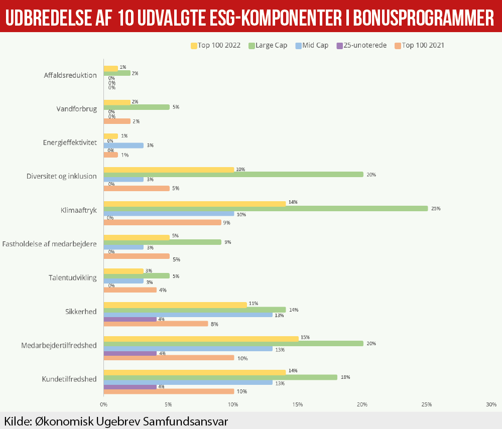 Han tilføjer: ”Det er specielt interessant, at brede E-relaterede kriterier såsom Klimaftryk, Affaldsreduktion og Vandforbrug integreres i bonusprogrammerne. Dette ses dog indtil videre primært hos large cap-selskaberne, men jeg forventer, at det hastigt vil sprede sig til mindre og ikke noterede virksomheder. Dette blandt andet fordi der er fokus på området, og fordi der blandt andet i selskabsloven er indført et krav om, børsnoterede selskabers vederlagspolitik skal bidrage til bæredygtighed.”