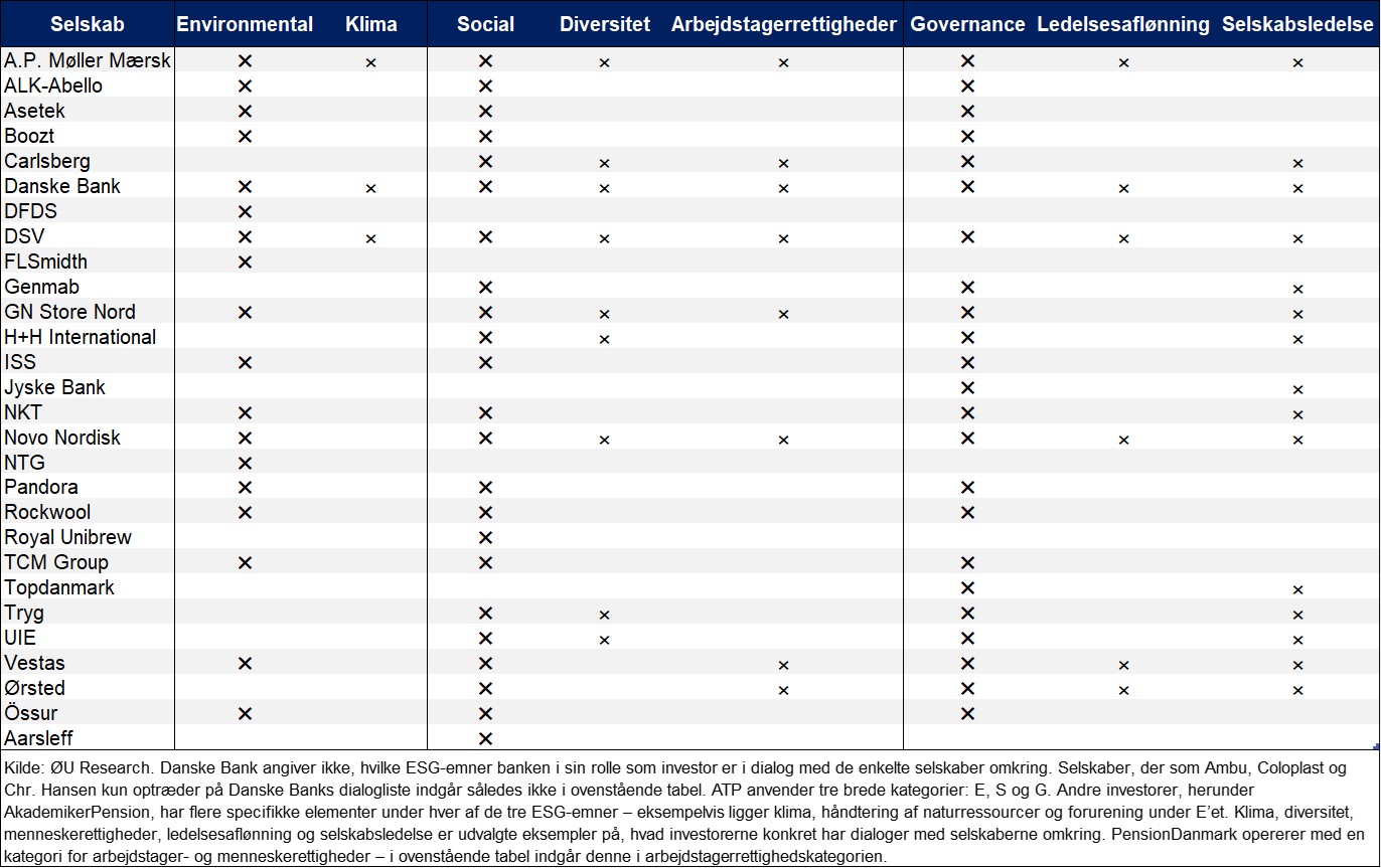 En del danske selskaber er i dialog med danske investorer omkring både E, S og G’et i ESG. Det gælder eksempelvis AP Møller – Mærsk, Danske Bank, DSV, Novo Nordisk og Vestas. For andre, eksempelvis Carlsberg og Genmab, omhandler investordialogerne kun S og G. Og for nogle, herunder Royal Unibrew og Aarsleff, drejer det sig kun om S’et.