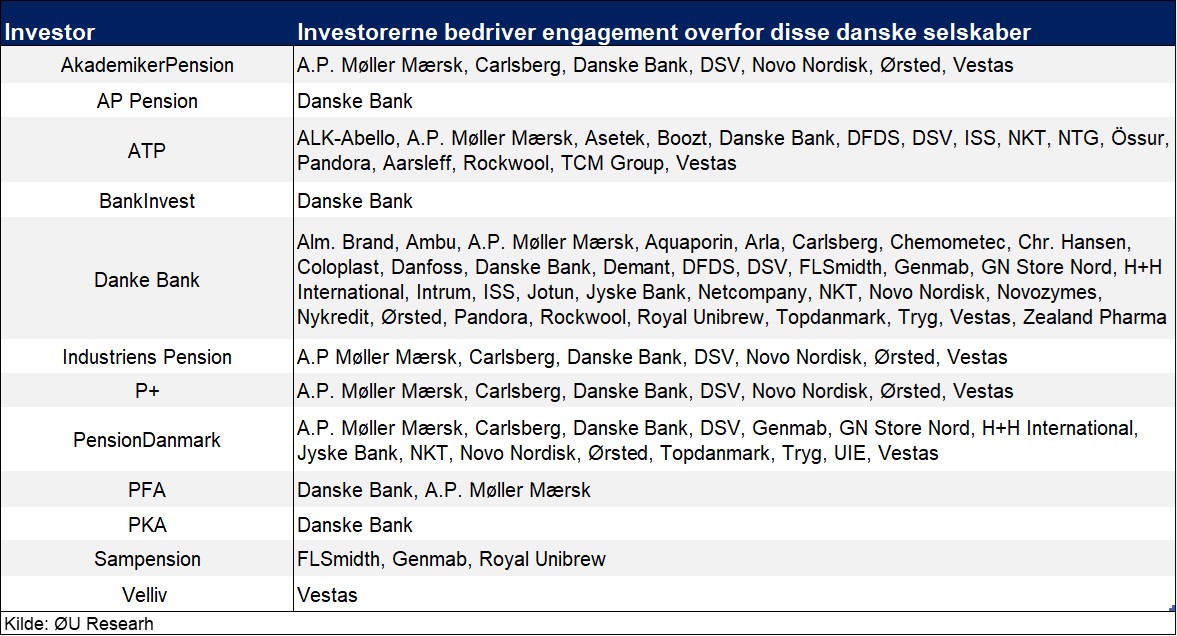 Som det fremgår af tabellen, er der stor forskel på, hvor mange danske selskaber hver investor har dialog med. Danske Bank bedriver engagement med 35 danske selskaber, hvorimod AP Pension, Danske Invest, PKA og Velliv kun har dialog med ét dansk selskab. For de tre første er selskabet Danske Bank, hvorimod Velliv er i dialog med Vestas.