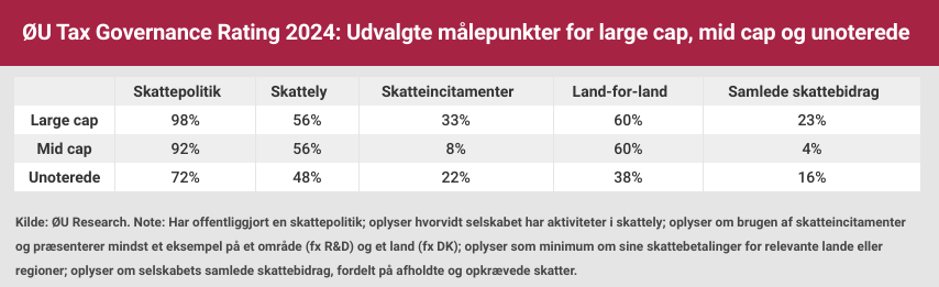 Andelen af unoterede selskaber, der har offentliggjort en skattepolitik, er også steget. I år har 72 procent af selskaberne udgivet en skattepolitik mod 58 procent sidste år, en stigning på 24 procent. Trods fremgangen halter de unoterede dog stadig efter de børsnoterede: 98 procent af large cap og 92 procent af mid cap-selskaberne har udgivet en skattepolitik.