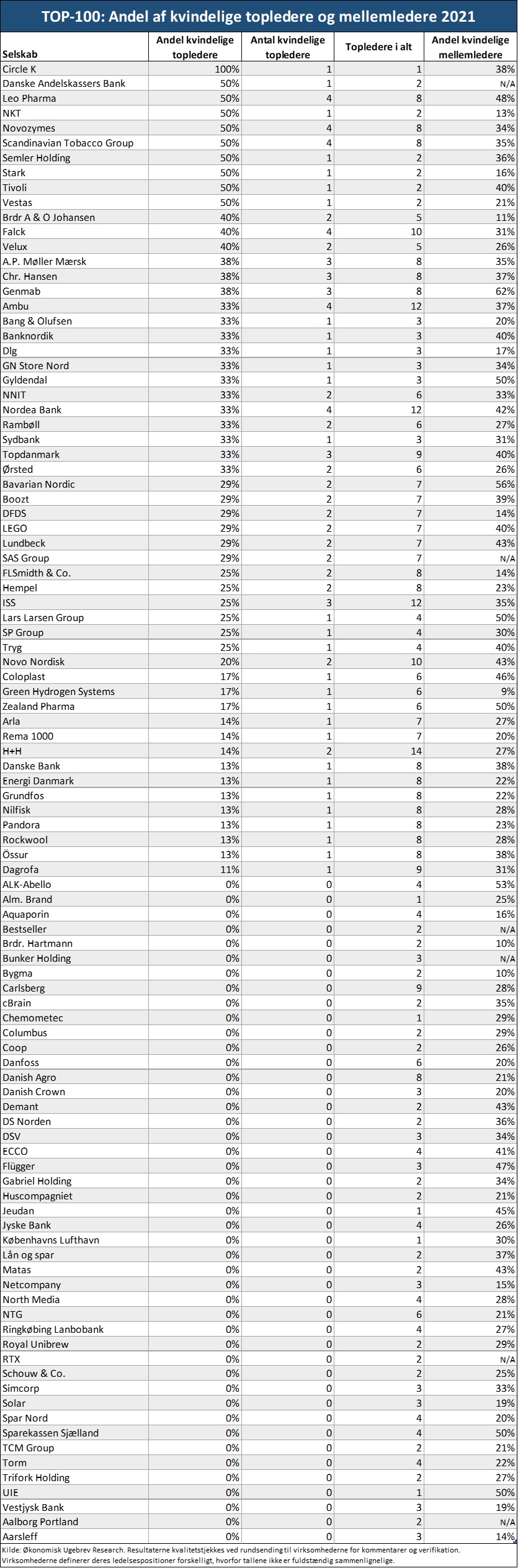 * Top-100 består af alle danske large og mid cap-selskaber samt af de 25 største unoterede virksomheder. Undersøgelse bygger på seneste årsrapporter dvs. 2021 data, hvorved procentandelen for kvinder i virksomhedernes ledelsesorganer kan have ændret sig for visse virksomheder. Eksempelvis har Danfoss øget andel af kvinder i topledelsen således, at selskabet går fra en andel på nul procent kvinder i 2021 til 14 procent kvinder i 2022.