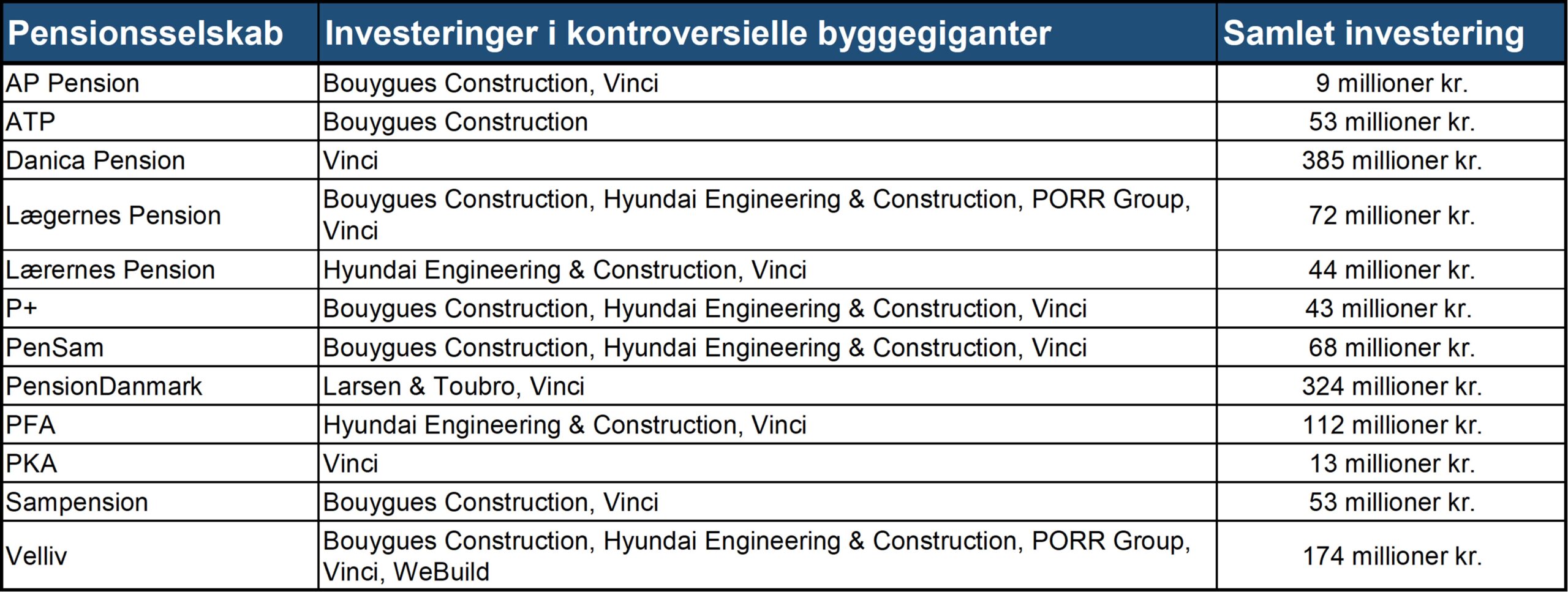 Som det fremgår af nedenstående oversigt, optræder seks af de otte kontroversielle byggegiganter på beholdningslisterne hos et eller flere af de danske pensionsselskaber (CRCC og Besix Group undtaget).
