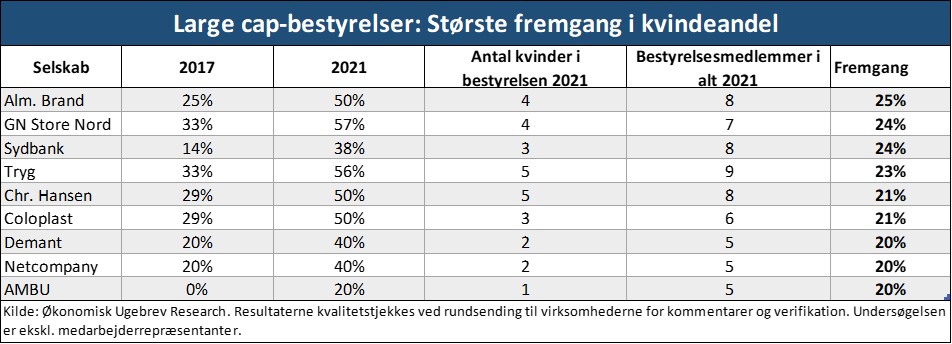 Siden 2017 har ni large cap-selskaber øget andelen af kvinder i bestyrelsen markant, her forstået som en stigning på 20 procent eller derover. Den største fremgang står forsikringsselskabet Alm. Brand for. I 2017 var hvert fjerde bestyrelsesmedlem i Alm. Brand en kvinde, i 2021 var det steget til hver anden. Forsikringsselskabet har dog været knap så dygtig til at øge andelen af kvindelige ledere – i 2017 lå procentsatsen for kvindelige ledere på 26 procent, hvilket i 2021 faldt en smule til 25 procent. Desuden bestod topledelsen i 2017 af nul kvinder og en mand, hvilket er uændret i 2021.