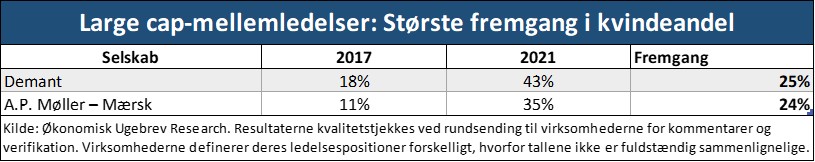 I forhold til at forøge andelen af kvinder på andre ledelsesniveauer, altså under executive management, er det kun rederigiganten A.P. Møller – Mærsk og høreapparatsproducenten Demant, der siden 2017 har øget andel af kvinder markant. I 2017 var der i Demant 18 procent kvindelige ledere – i 2021 var andelen steget til 43 procent. I samme periode steg andelen af kvindelige ledere i A. P. Møller – Mærsk fra 11 til 25 procent.