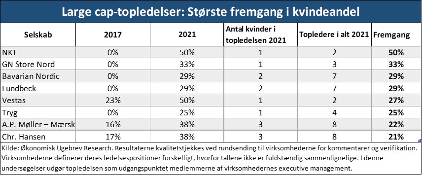 Siden 2017 har otte danske large cap-selskaber øget andelen af kvinder i topledelsen markant, hvor topledelsen defineres efter selskabets egen definition, typisk en bred ”executive management”. NKT topper listen med en fremgang på 50 procent. Fremgangen skyldtes, at virksomheden har ansat en kvindelig CFO, hvorved den beskedne topledelse på to personer har lige mange mænd og kvinder, nemlig en af hver.